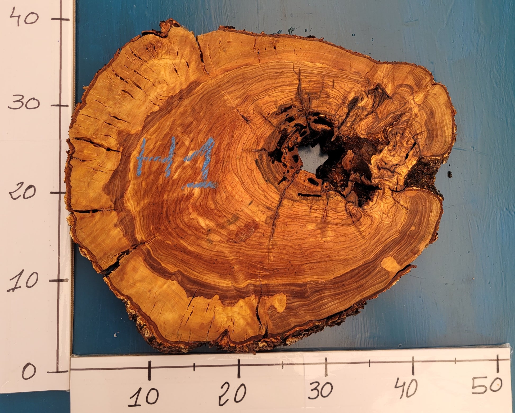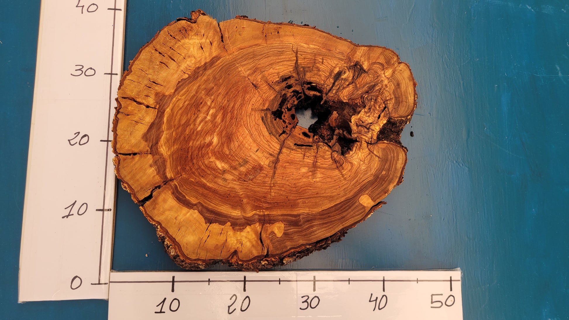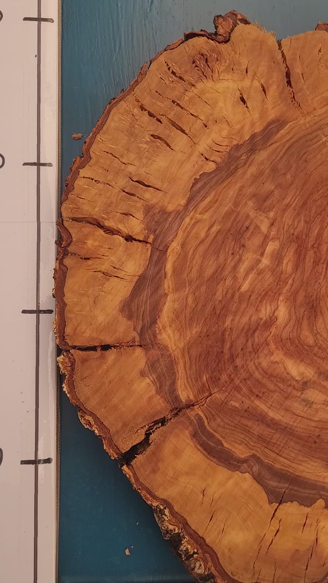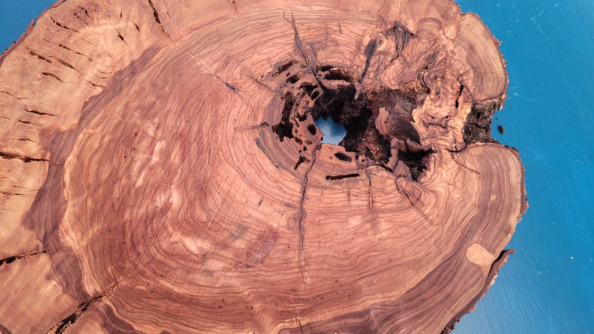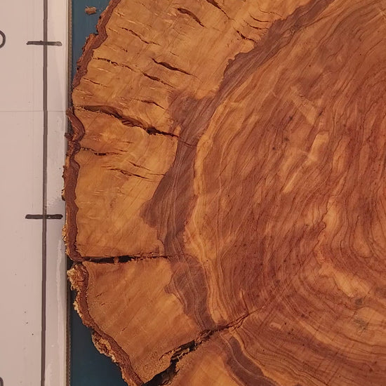 Rodaja de olivo centenario con gran superficie y un veteado excepcional. La pieza combina elegancia natural con formas orgánicas que la hacen ideal para bases decorativas, sobremesas o creaciones artesanales únicas. Medidas aproximadas: 40 cm de alto, 44 cm de ancho y 4,5 cm de grosor.