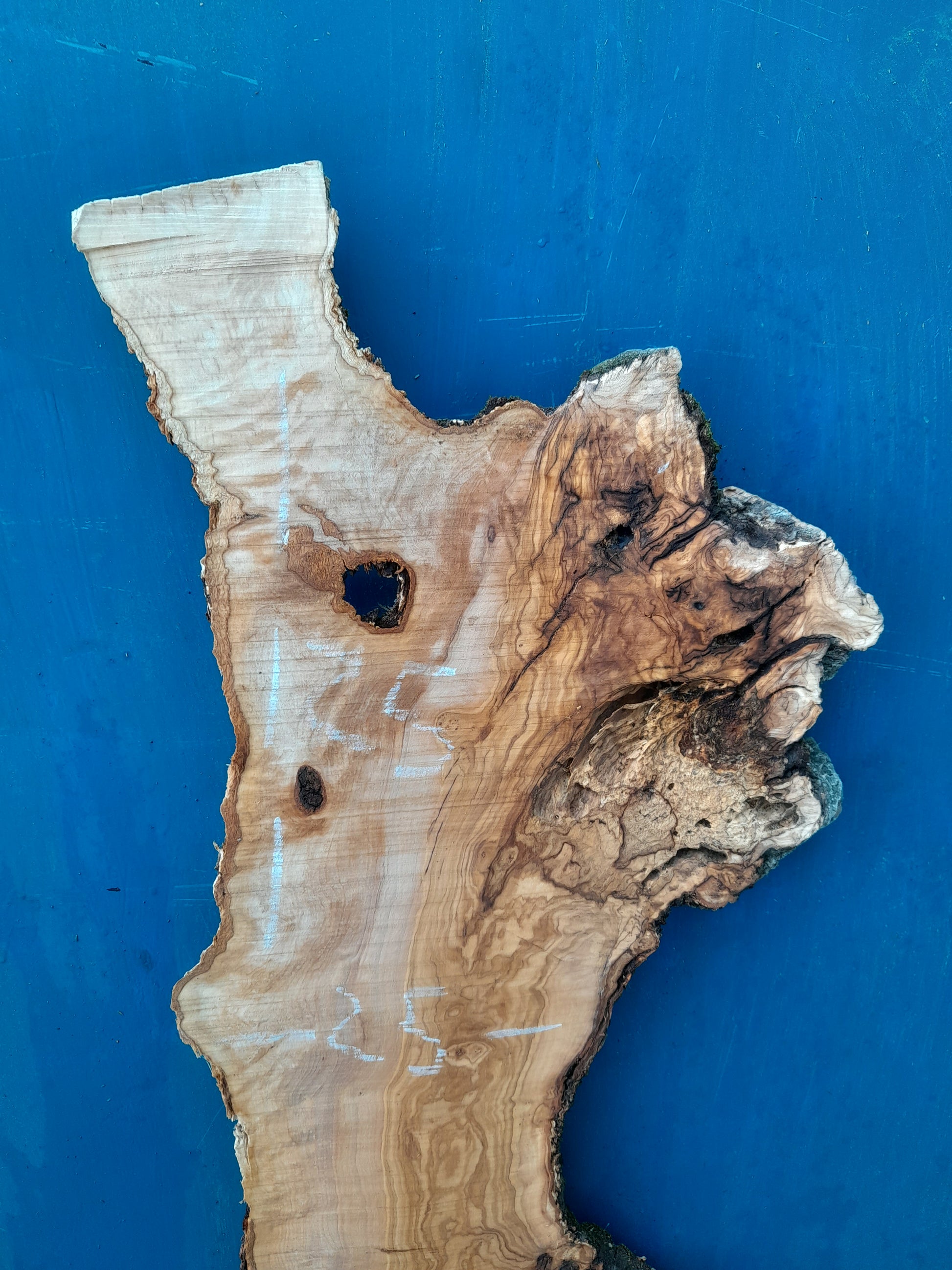 Tablero de olivo centenario de forma alargada, con contraste entre veta clara y zonas oscuras de corteza y nudos.