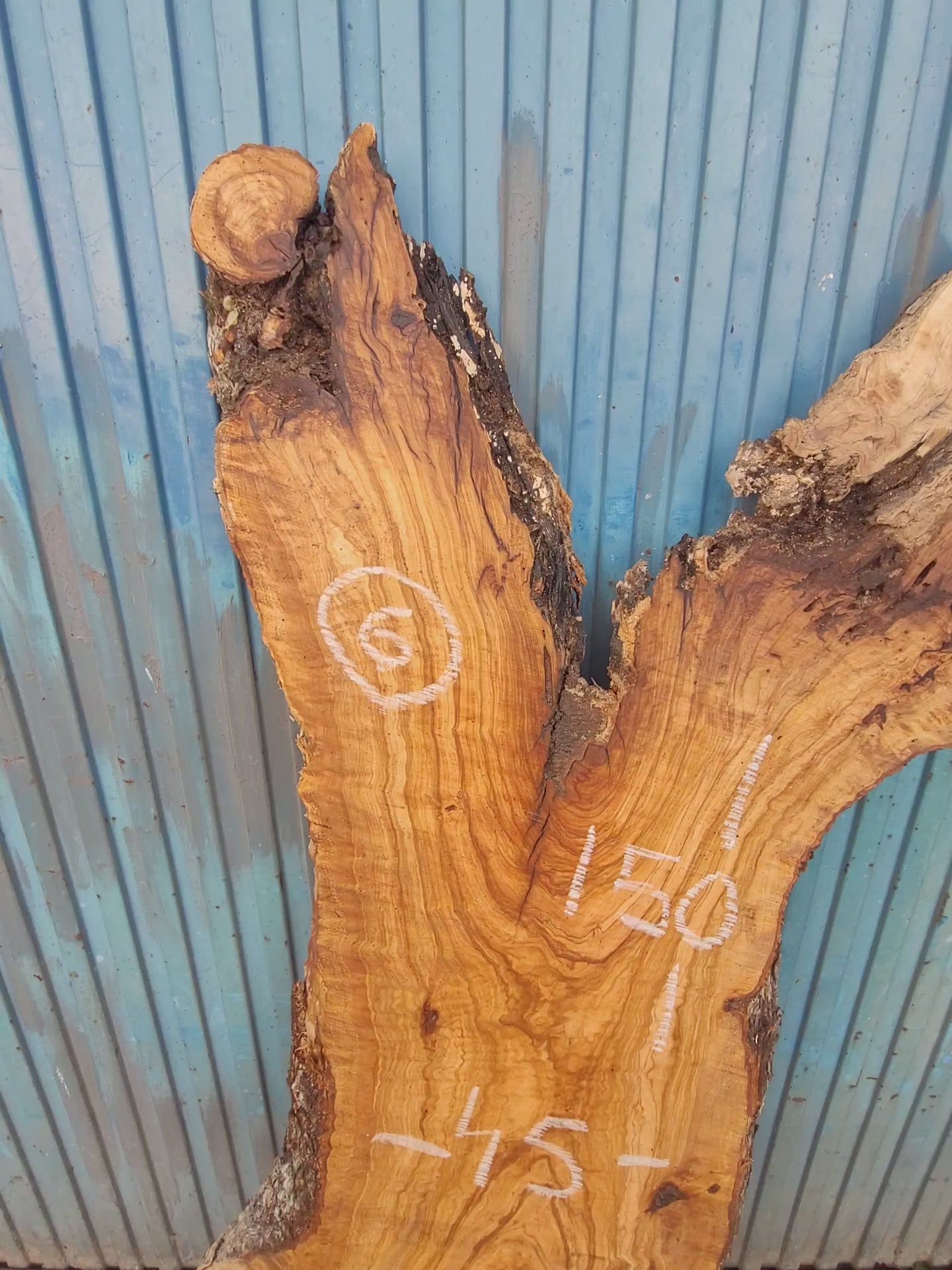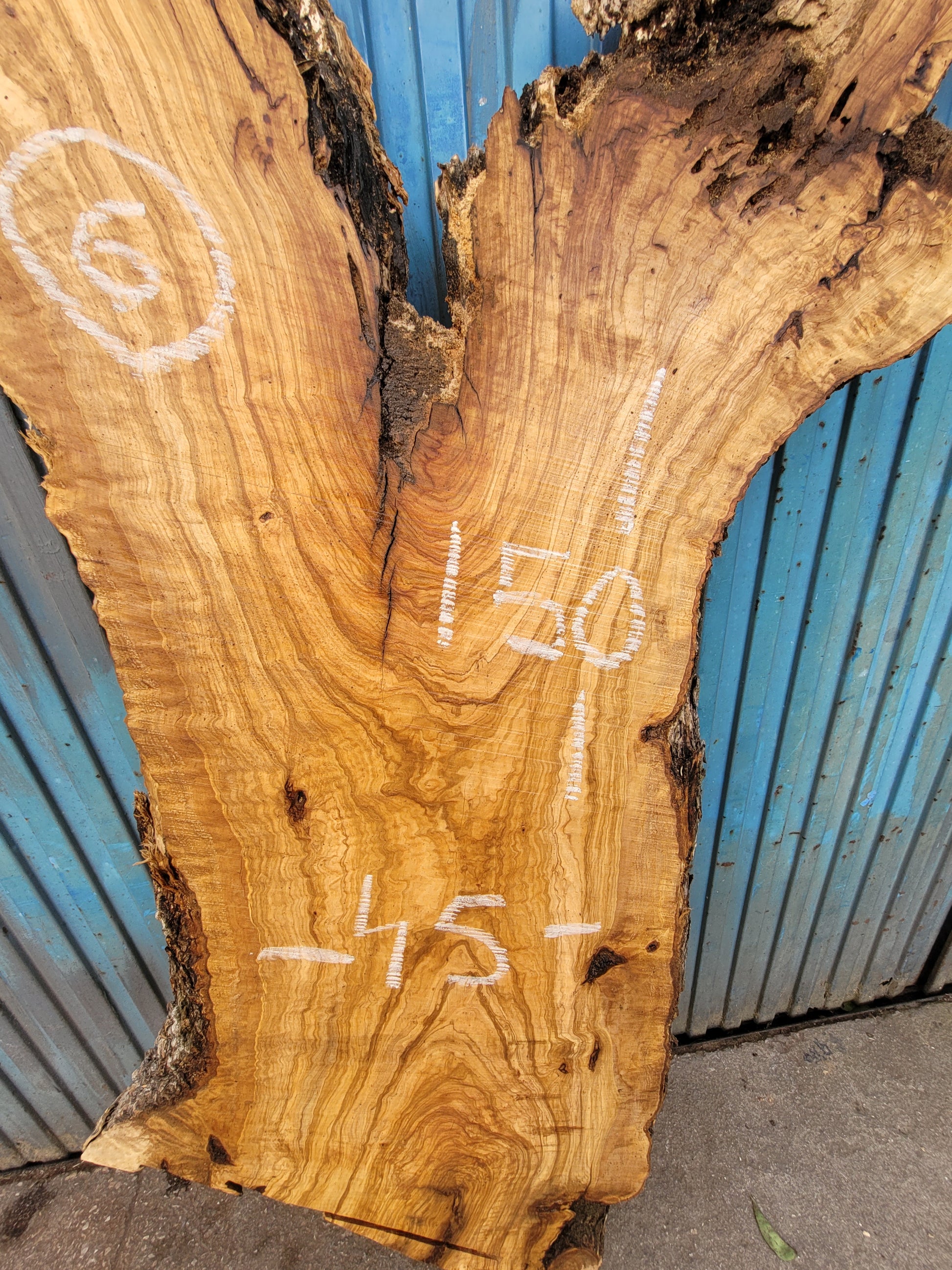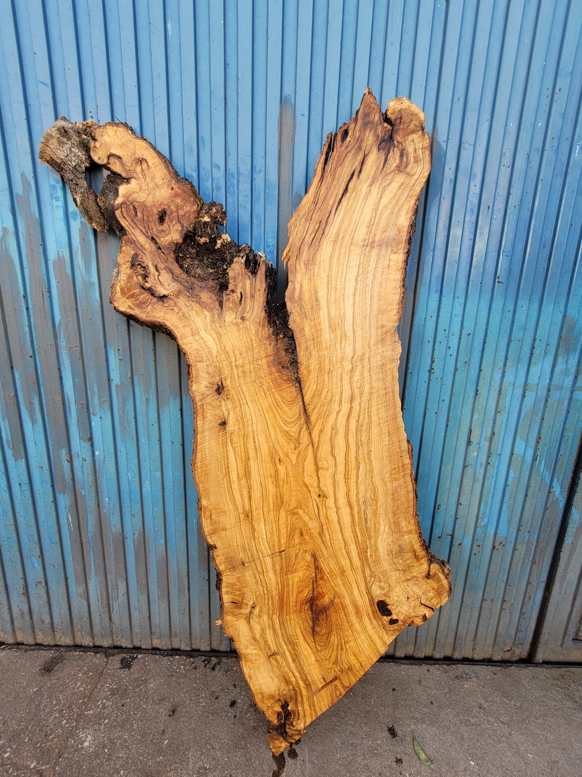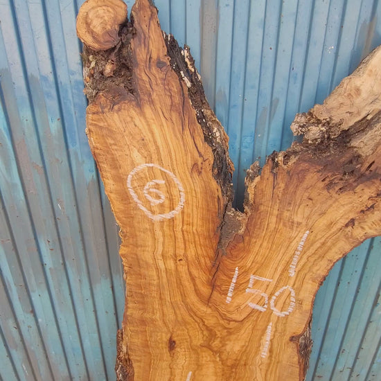 Tablón macizo de olivo con forma equilibrada y veteado vibrante. Presenta una rama sobresaliente y nudos vistosos que lo hacen ideal para proyectos con personalidad. Su grosor estable y caras planas permiten un uso directo, sin necesidad de resina. Perfecto para encimeras de lavabo o mesas con carácter natural.