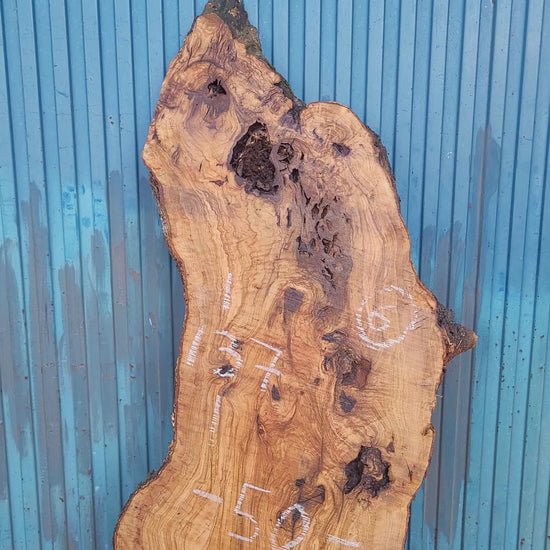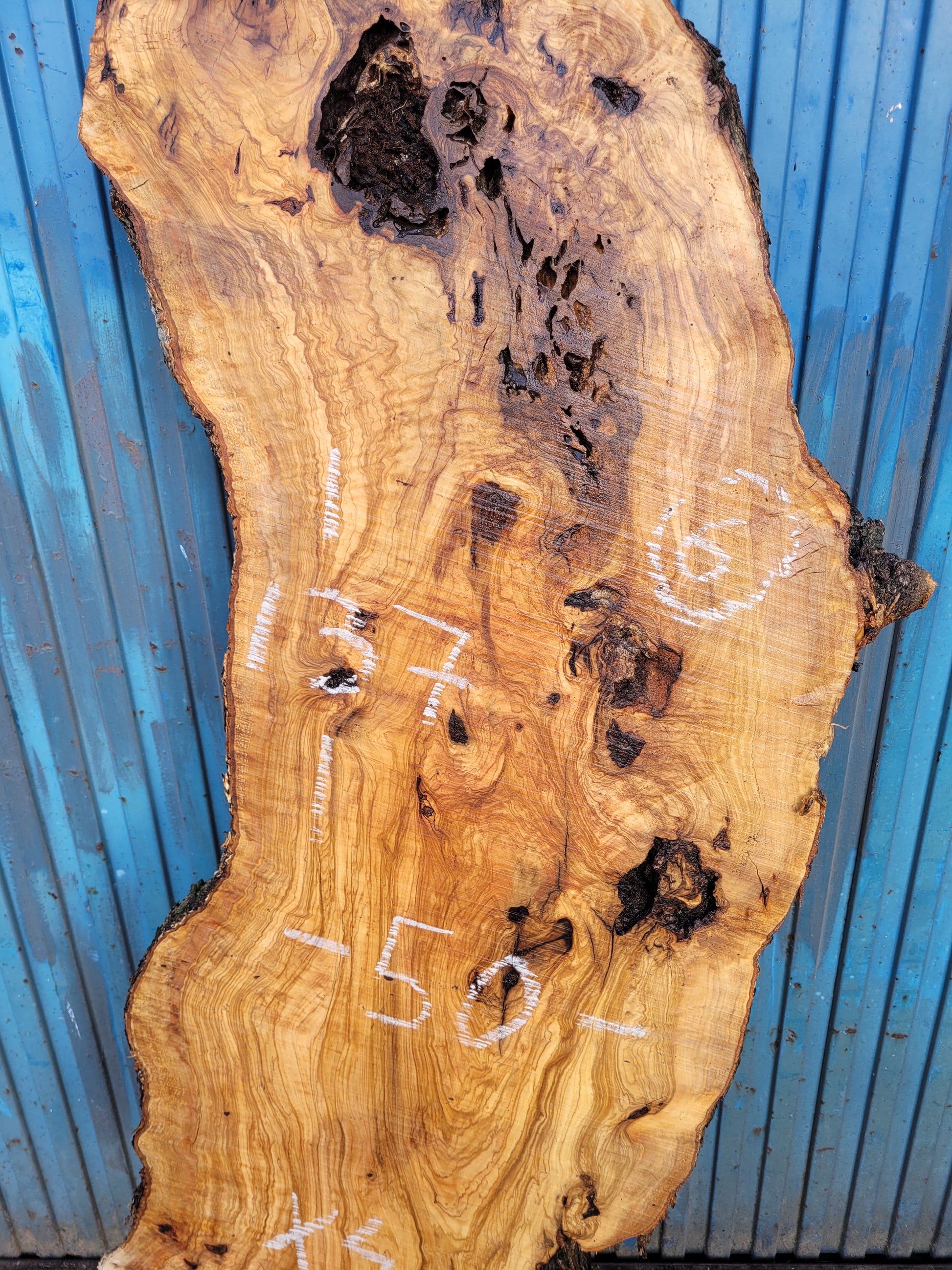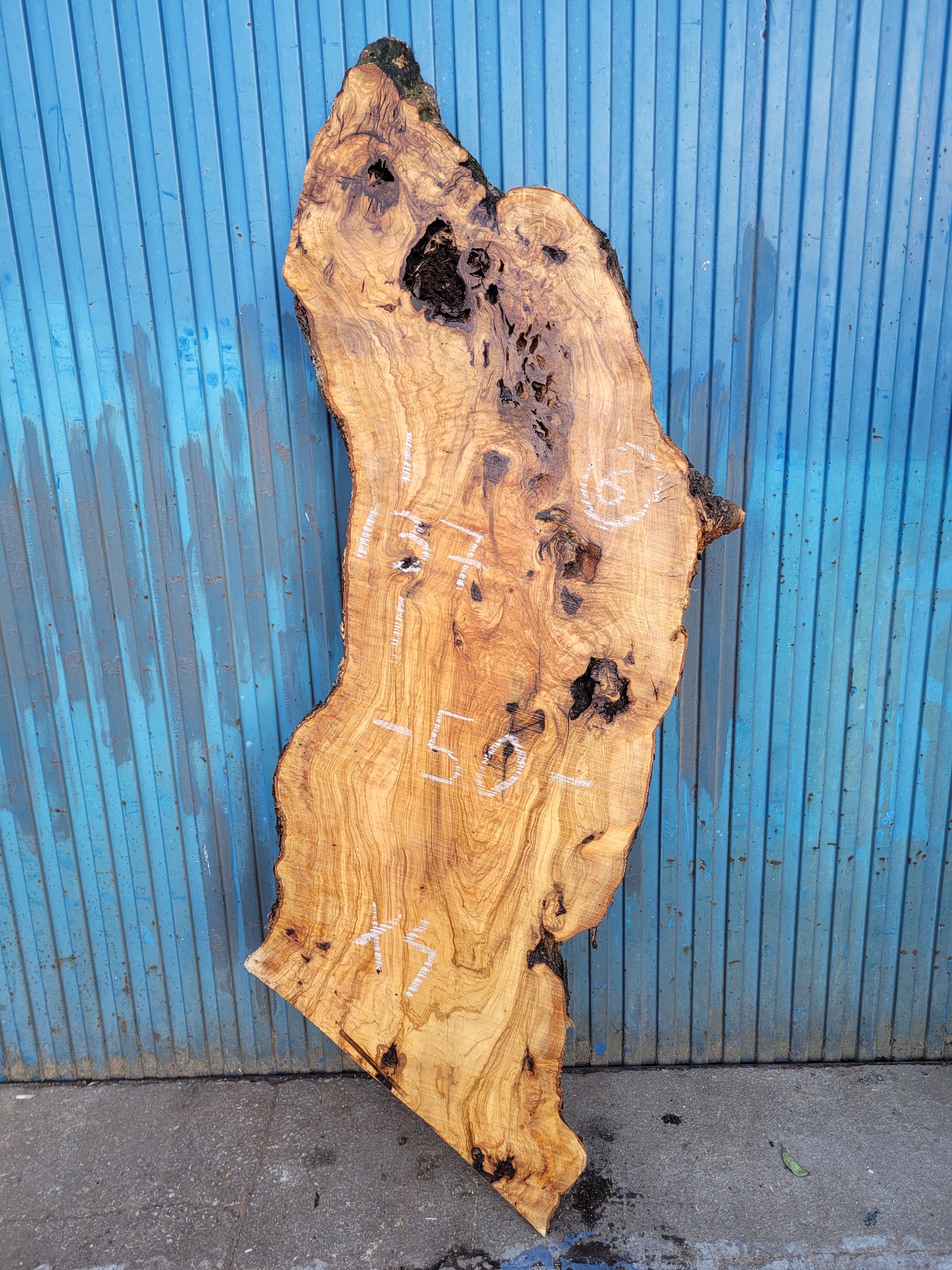 Tablón de olivo con formas curvas muy marcadas y nudos abiertos que realzan su aspecto natural. La veta es especialmente viva, con contraste y dibujo atractivo. Gracias a su cuerpo compacto y superficie estable, es ideal para usar directamente como mesa o encimera sin aplicar resina.